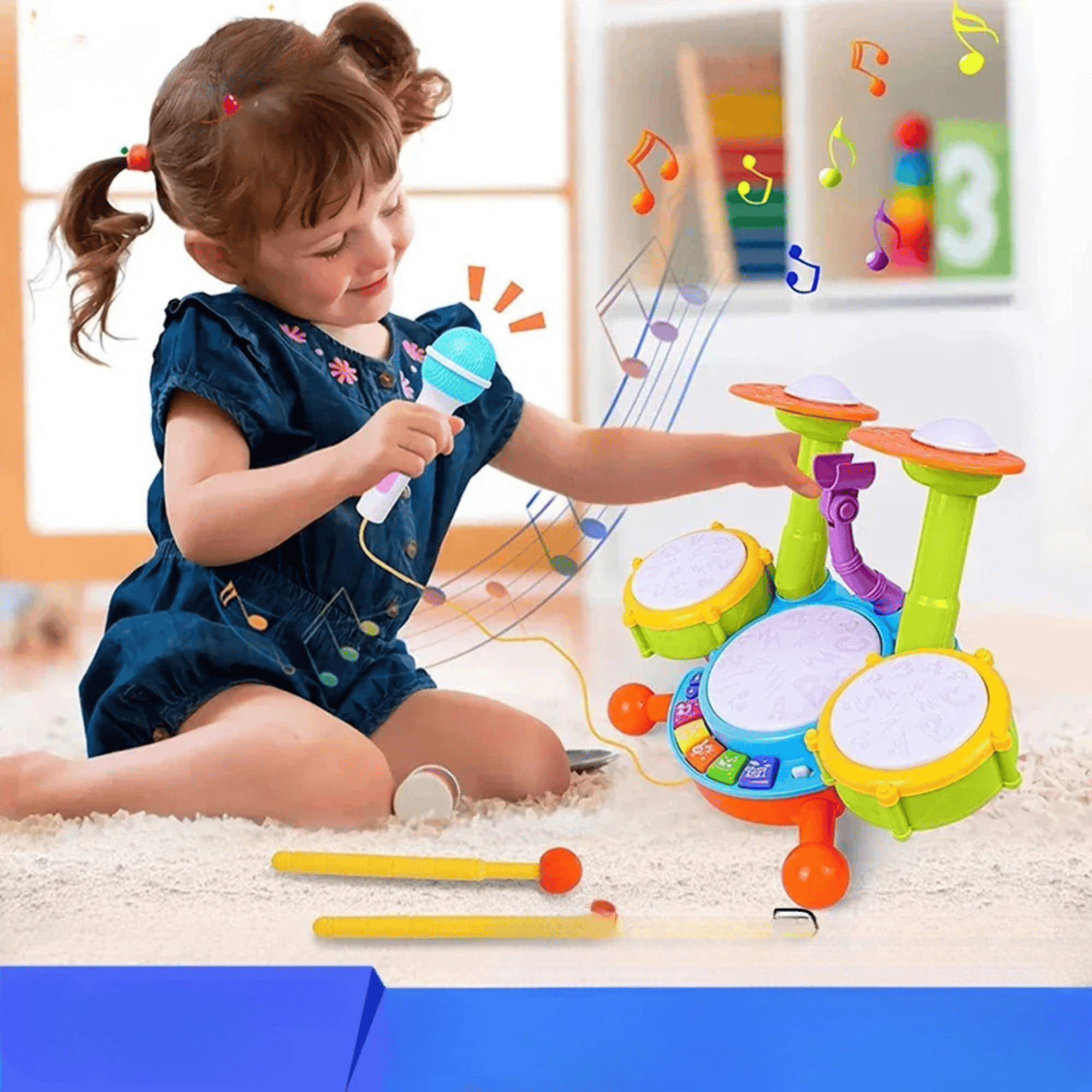 Mode d’emploi : Allumez le jouet via le bouton ON/OFF. L’enfant peut jouer avec les baguettes sur les pads, activer les modes via les boutons colorés, ou chanter avec le micro pour varier les plaisirs.