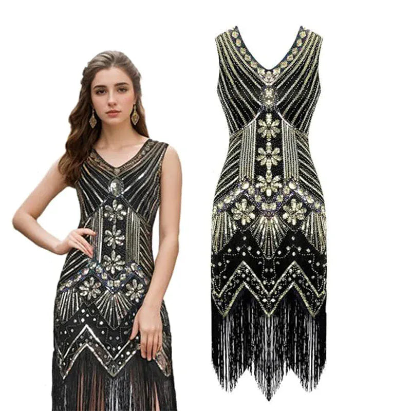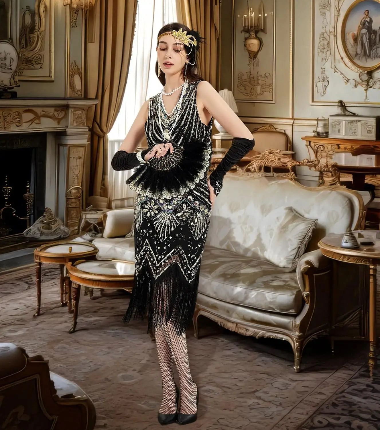 Design glamour : La robe noire avec des détails en sequins et des franges créera un effet scintillant à chaque mouvement. Idéale pour capturer l'esprit des fêtes Gatsby et des événements rétro des années 20.